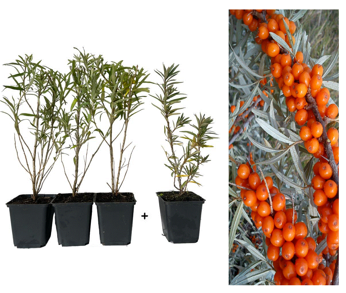 Das Sanddorn-Set (Hippophae rhamnoides) besteht aus 3 weiblichen und 1 männlichen Pflanzen und ist ideal für den Anbau von vitaminreichen Beeren. Sanddorn ist ein robustes, winterhartes Strauchgewächs, das reichlich orangefarbene Früchte produziert, die sich hervorragend frisch, zu Säften oder Marmeladen verarbeiten lassen.